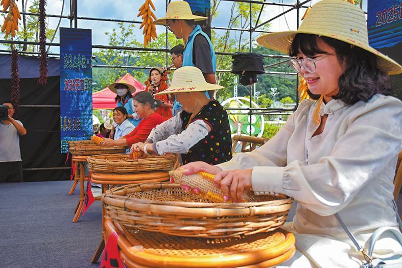 剥玉米粒比赛,大家手法娴熟,一颗颗玉米粒快速剥落。