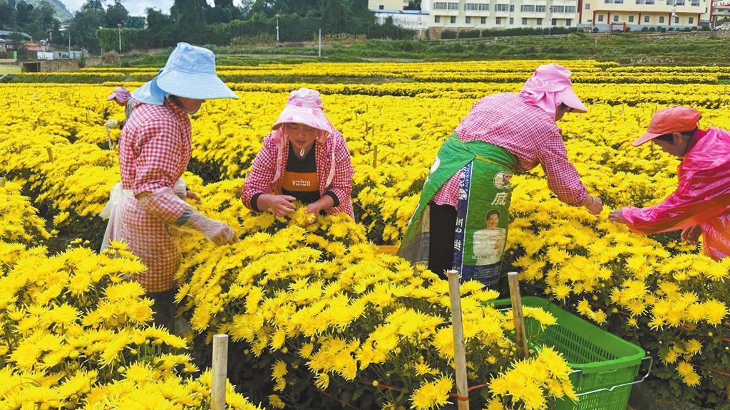 金秋时节,小街村、甲浦村的金丝皇菊竞相绽放,金黄的花朵在阳光下熠熠生辉。农户穿梭在金色的花海中,忙着采摘金丝皇菊。采摘后的金丝皇菊,第一时间被送到村办公司进行分拣、晾晒、烘干。村办公司内,工人正按照花朵大小、完整度分拣金丝皇菊。近年来,小街村、甲浦村通过“党总支+村办公司+订单+农户”的发展模式,引导农户种植金丝皇菊,并在加工环节为农户提供就业岗位,带动群众增收26万余元。此外,小街乡还通过举办“花山节”等文化活动,吸引游客前来观赏、采摘金丝皇菊,带动乡村旅游发展,为当地经济发展注入活力。