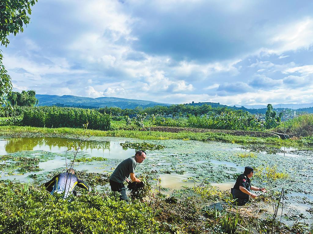 水面上,翠绿的菱盘层层叠叠,饱满的菱角就藏在叶片下面。螺蛳铺村村民王江琼和同伴们一起来采摘菱角,他们有的用钉耙把菱盘打捞至水边,就地采摘菱角;有的则穿上水鞋探入水中,轻拨菱叶,顺势托起菱藤,随着“哗啦”一声水响,藤蔓出水,根部缀着的成熟菱角在阳光下闪闪发亮,新鲜度满分。王江琼告诉记者,每年中秋节前后是吃野生菱角的最佳时节,想吃菱角的村民都会来摘上一些尝尝鲜。
