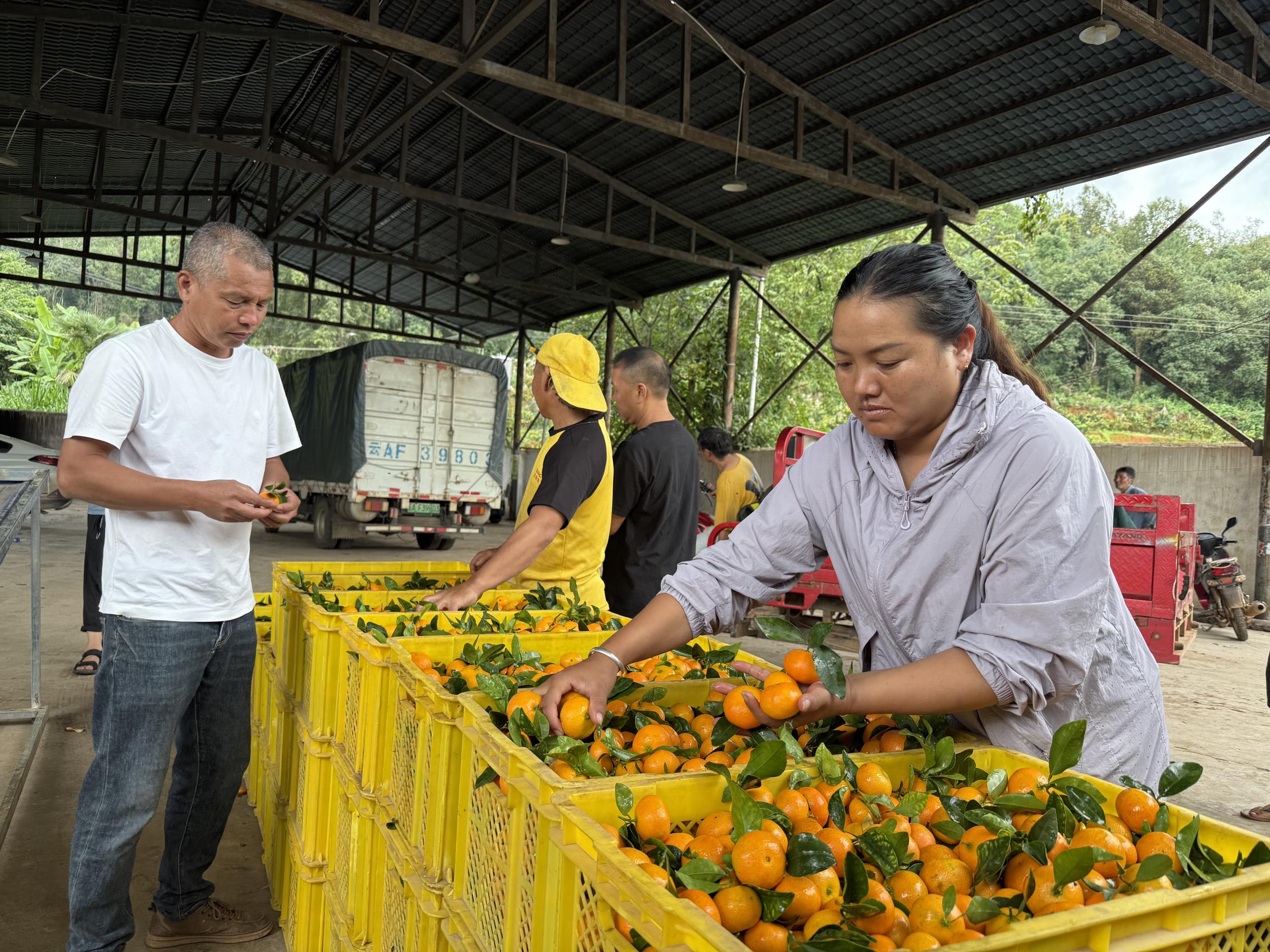 在位于果洛垤小组村口的一个收购点,交售金秋砂糖橘的果农、运输车辆络绎不绝。工人们正进行称重、分拣、打包、装车,一批批新鲜砂糖橘即将发往全国各地。据了解,当前上市的是首批金秋砂糖橘,因上市时间早、品质优,市场行情一路向好。