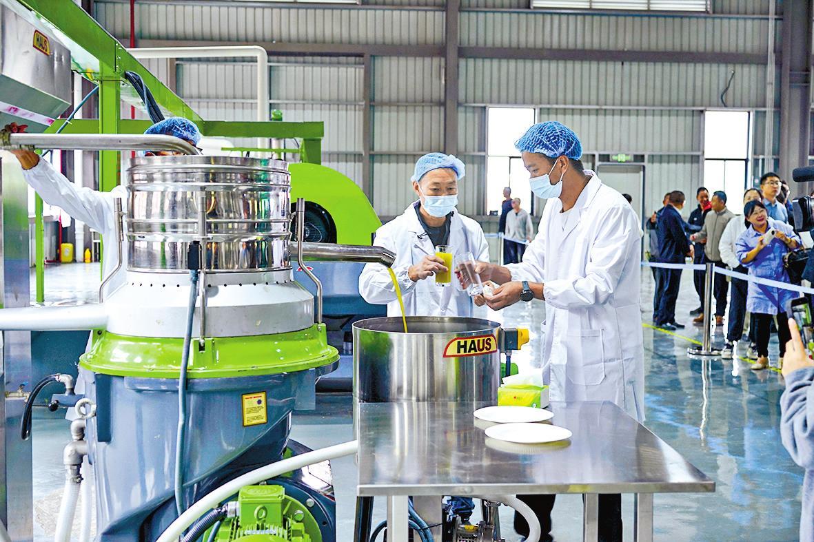 9月26日上午,在位于峨山县甸中镇的云南峨山高原特色油橄榄生产中心,一筐筐油橄榄鲜果沿着传送带进入全自动生产车间,经过清洗、碾磨、压榨、分离等一系列生产程序后,金黄色的初榨橄榄油缓缓流出。据现场工作人员介绍,伴随着甸中镇2万多亩油橄榄的陆续成熟,今年的油橄榄采收和榨油工作也随之启动。