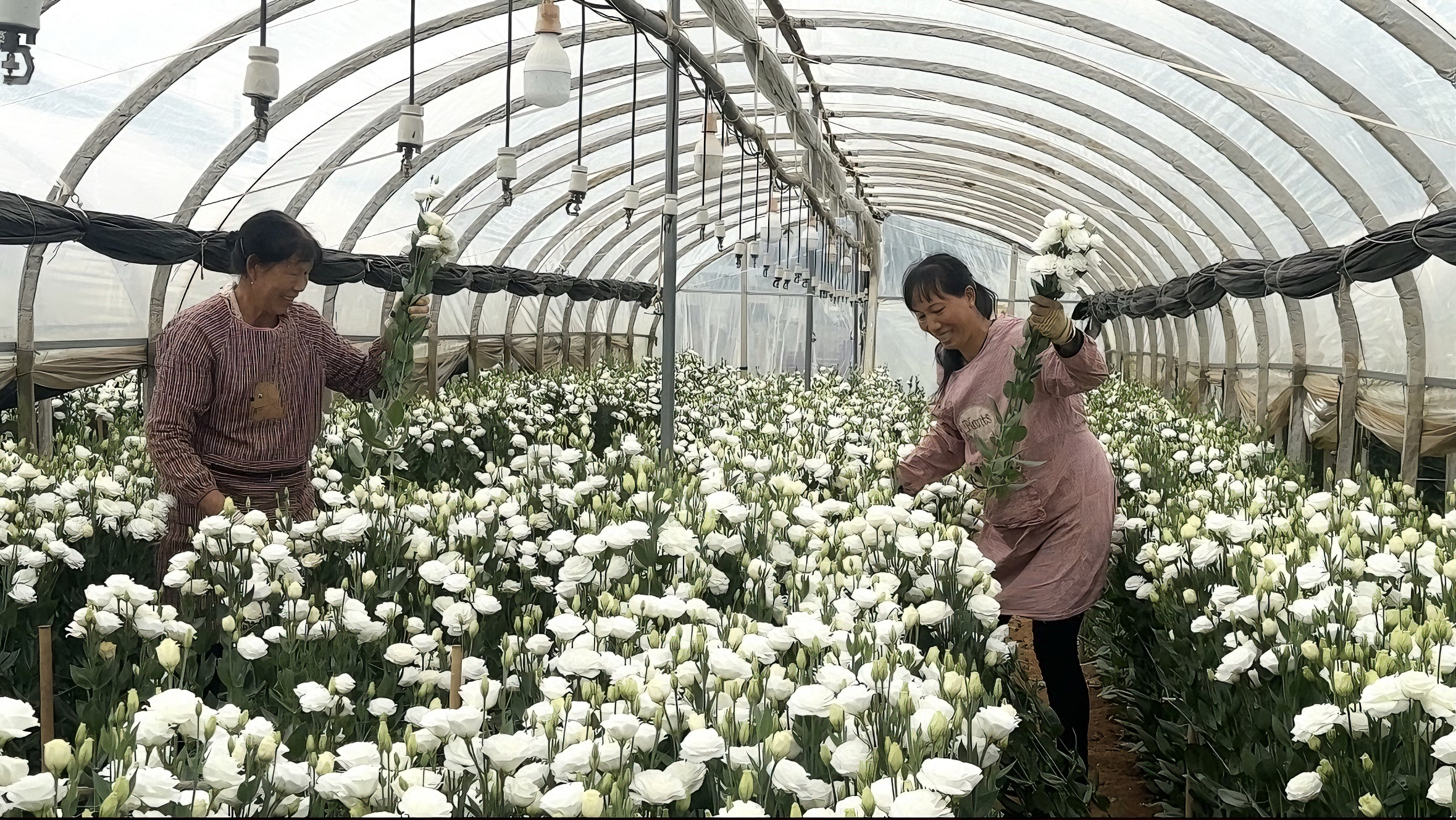基地负责人黎志兵说:“我种植洋桔梗20余亩,共有41个大棚,预计产值30余万元。洋桔梗生长周期短,从幼苗栽种到鲜花售卖仅需4个月左右,能带来持续经济收益。基地日均采摘量达3000至4000把,主要销往昆明斗南市场。”目前,该基地有固定工人4人,栽种、季节性用工可达30余人。