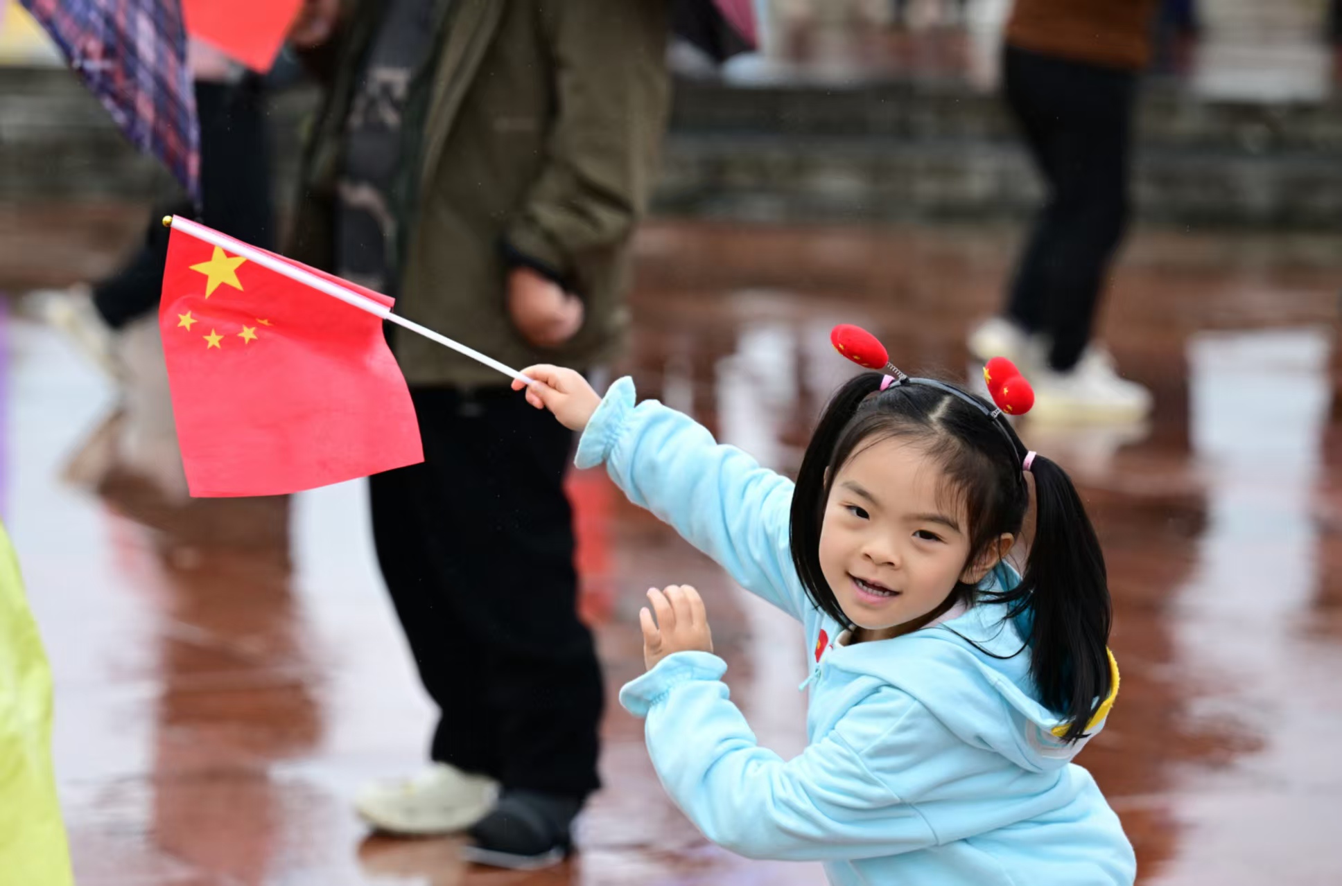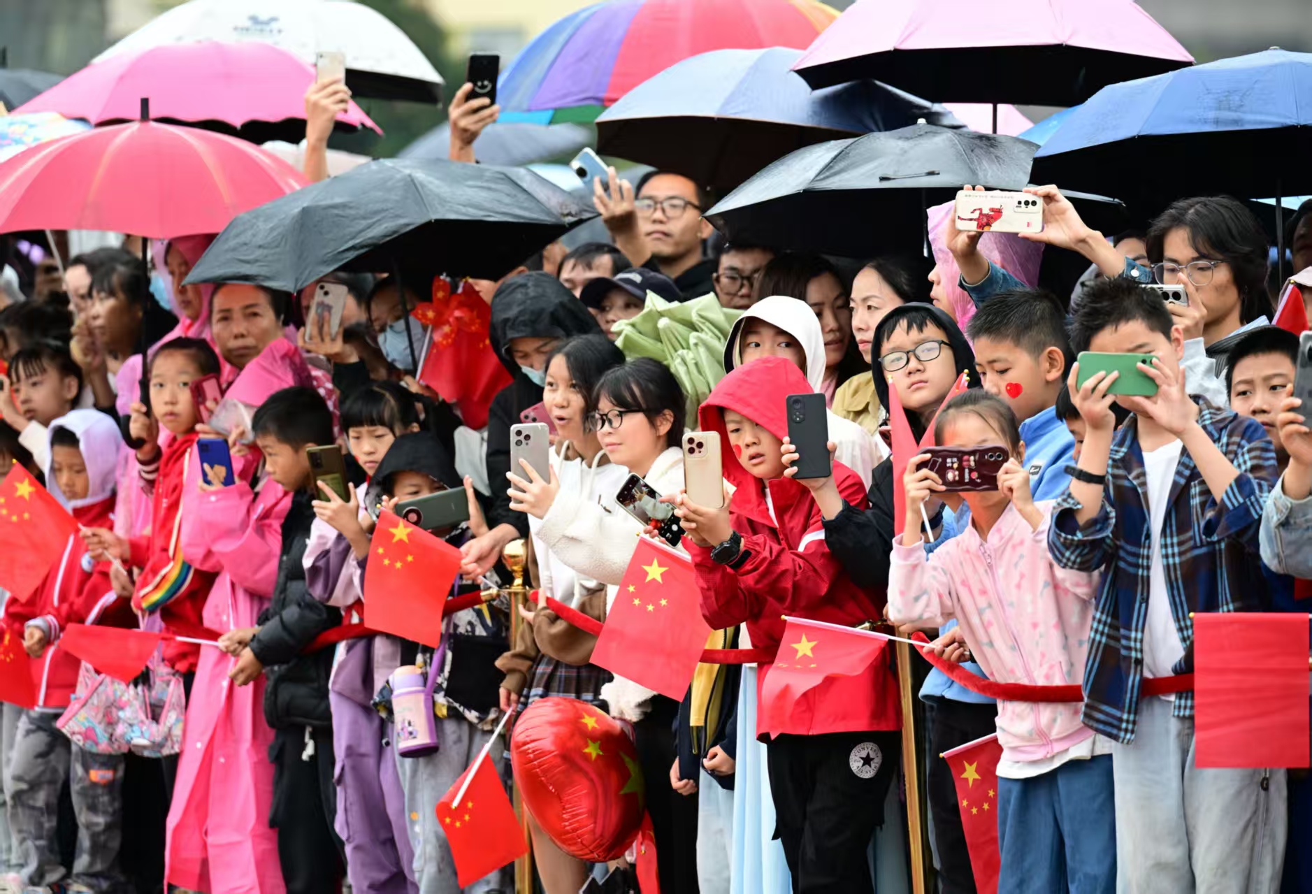 人群中有不少带着孩子来观看升旗的家长。一对父子撑伞站在人群中,当国歌响起,孩子举起右手行礼,小身板站得笔直。家住红塔区的李媛也带着两个女儿来观看升旗,她表示,希望用这种特别的方式,让孩子亲身感受这庄严的时刻,将爱国的种子深植心中。