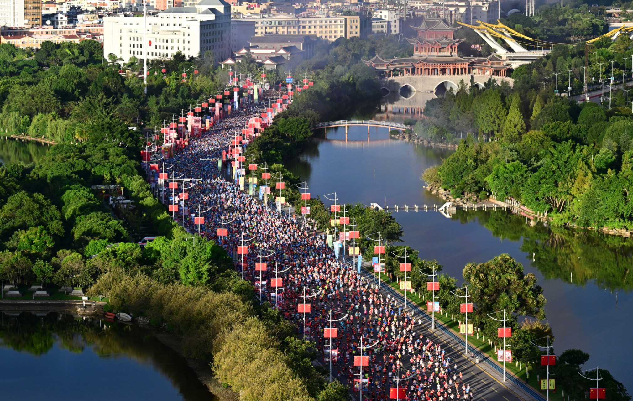 10月3日上午,2025玉溪马拉松在玉溪市红塔区聂耳广场鸣枪开跑,2万余名来自全国33个省区市的跑友参加了比赛。