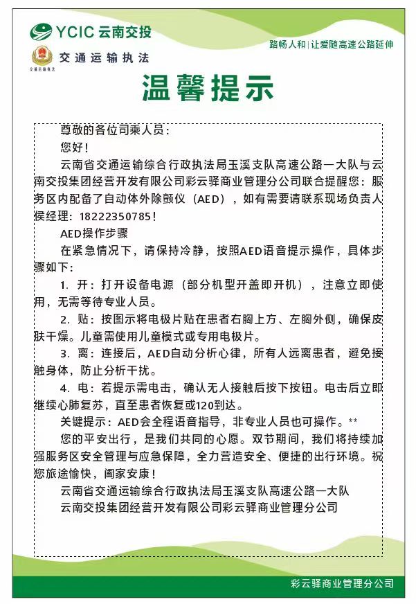 双节叠加,大流量出行。省交通执法局玉溪支队高速公路一大队积极协调玉溪市卫健委、市急救中心等专业机构,在昆磨高速玉溪段所有服务区(含刺桐关停车区)创新配置AED急救设备,实现此路段服务区全覆盖。9台AED设备的投用,将填补双节期间突发事件发生时,现场自助急救与专业医疗救援到达前的“黄金救援时间”空白,极大提升服务区的应急救治能力,让服务区不仅成为休憩驿站,更升级为生命守护站,彰显了高速公路服务从“保通畅”到“保温暖”的服务理念升级。