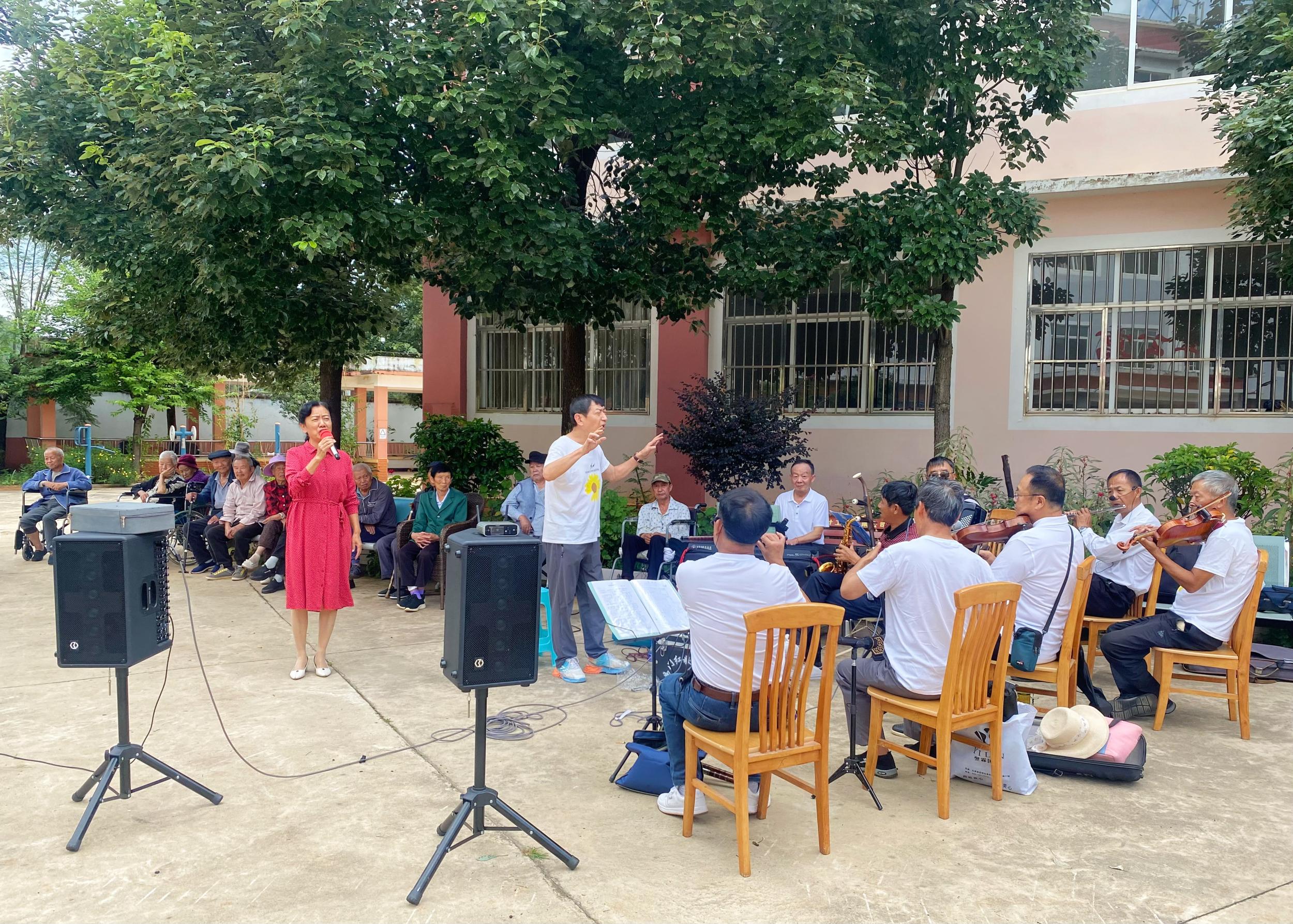 活动当天,由文艺爱好者组成的红歌乐队率先登场表演,当《我和我的祖国》《南泥湾》等经典歌曲的旋律响起,熟悉的曲调瞬间勾起老人们的记忆,不少人跟着轻轻哼唱。随后,乐队又带来具有地方特色的花灯曲目,欢快的节奏、亲切的唱腔让现场气氛热烈又温馨。