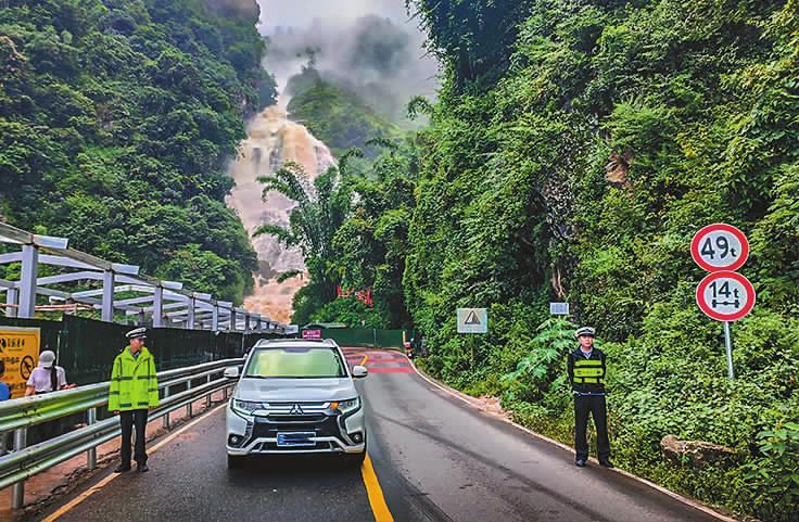 新平县公安局民辅警在南恩瀑布景点疏导交通,确保游客出行安全。通讯员 周洪宇 摄