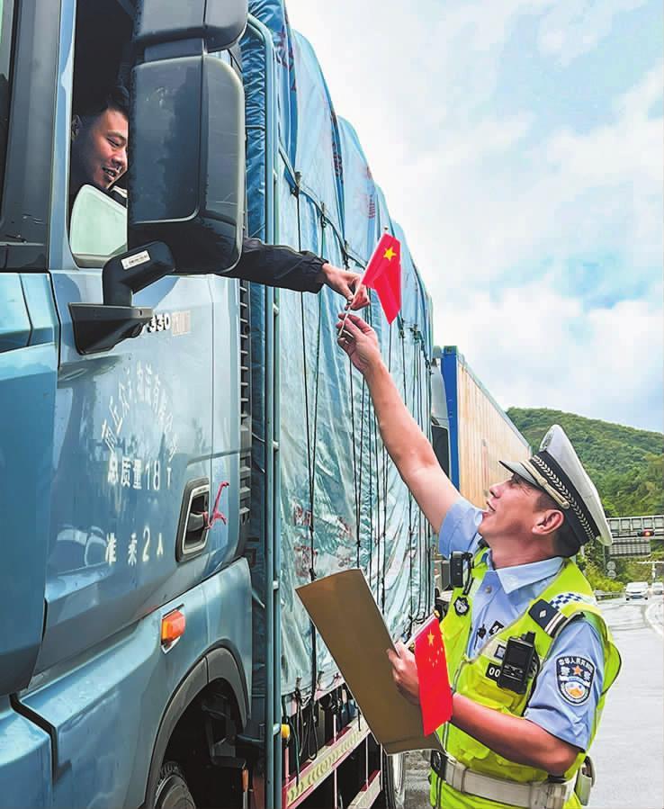 9月30日傍晚,玉溪市公安局高速公路交巡警大队民警胡锦文在大风垭口执勤点,对过往货车驾驶人进行长下坡安全提示,耐心讲解假期高速公路货车限时通行要求。通讯员 王菱 摄
