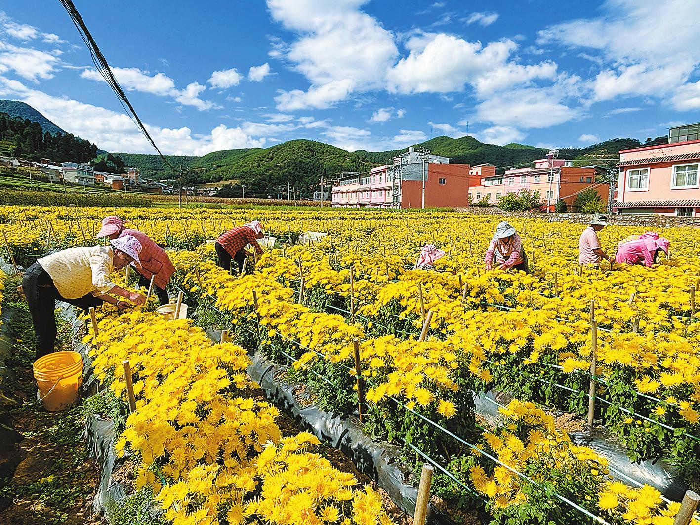 10月,易门县小街乡27亩金丝皇菊竞相绽放,金黄的花朵在阳光下熠熠生辉,工人们穿梭其间,娴熟地采摘着成熟的金丝皇菊。