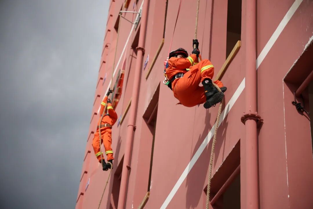 在单兵对决中,5000米负重跑中背负十余斤装备奋力前行,400米疏散物资救人扛假人、搬气瓶、拖水带;攀登挂钩梯与4楼绳索攀爬如灵猿登顶;枪炮协同灭火、纵深灭火救人,班组协作以默契诠释“练为战、战必胜”。