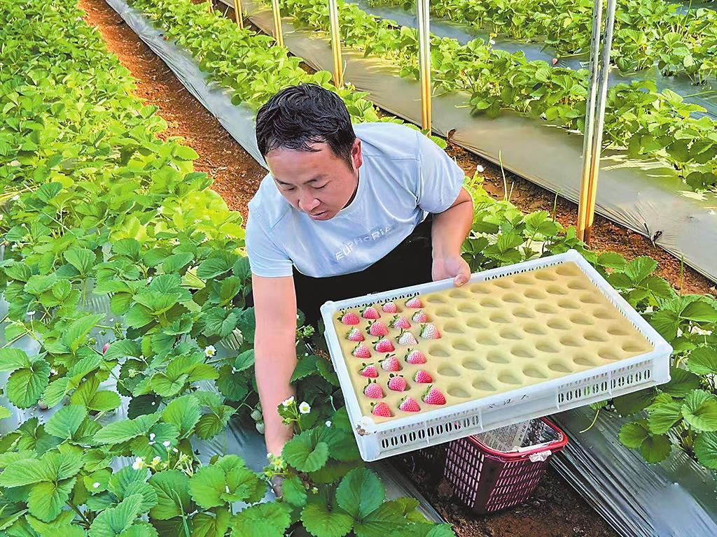 走进草莓种植户宋江文的种植基地,一颗颗草莓挂满藤蔓,粉红的果实饱满诱人。