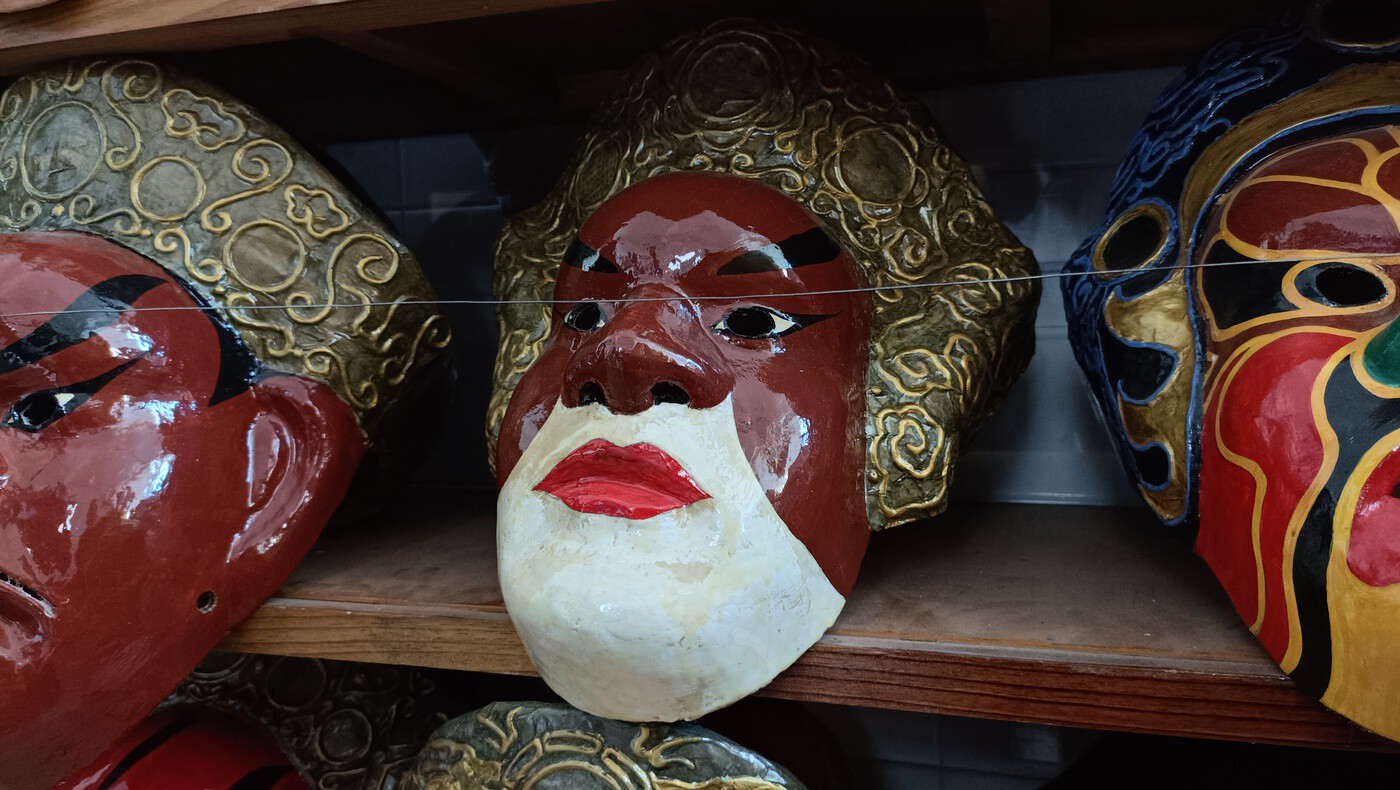 关索戏面具以纱布、棉纸、石膏为材,需历经制模、糊裱、连接、批灰、彩绘、装饰等多道工序,每一道工序又包含诸多细节。“每一步完成后都必须自然风干,若用加温方式,面具极易开裂脱落。”张鸿坤说,制作面具不仅考验耐心与细致,更需具备一定的绘画功底。他跟随父亲苦学五年,才真正掌握了这门手艺。