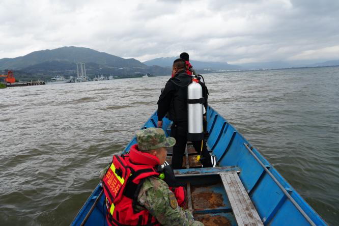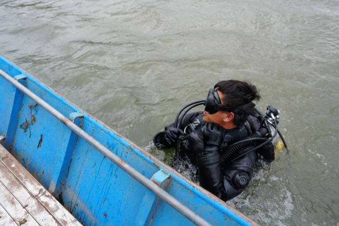 上午8时,第一批潜水员入水。李云川熟练地背滚入湖,气泡在他周围翻滚,随后便消失在湛蓝的湖水中。水面上的接应员乘坐打捞船只,保持3米左右的安全距离跟随水下的队员,以便随时提供支援和协助打捞。