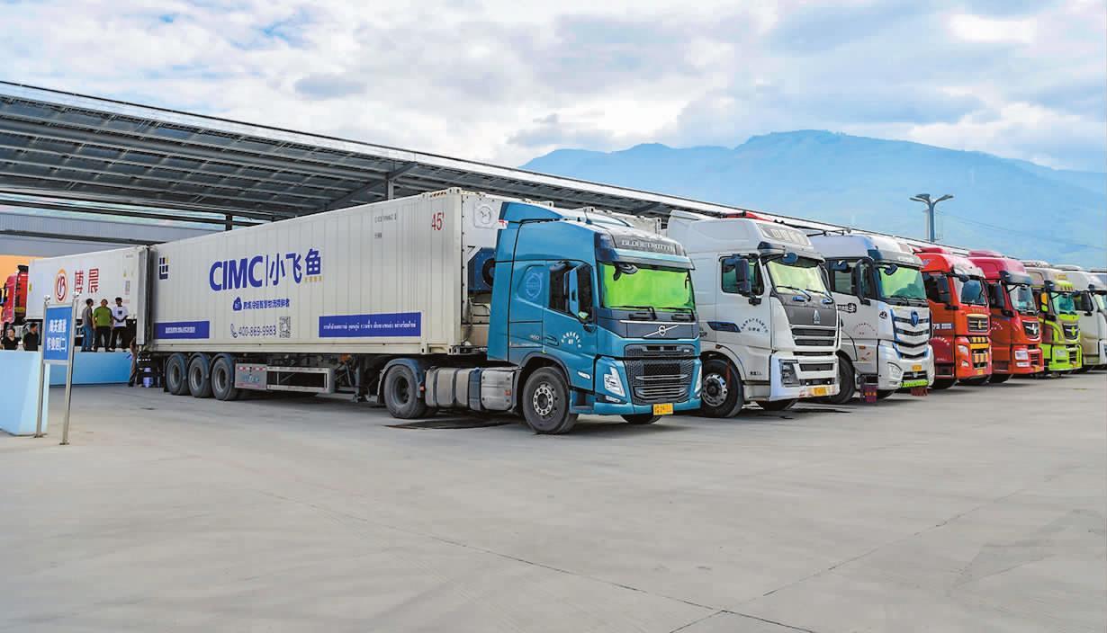 在位于元江县甘庄街道的元江中老铁路跨境物流产业园作业区内,多辆满载蔬菜水果等货物的车辆整齐停放,等待海关查验后即将前往泰国。这里正以“中老铁路+跨境公路”的多式联运枢纽姿态,成为跨境物流的“黄金通道”。