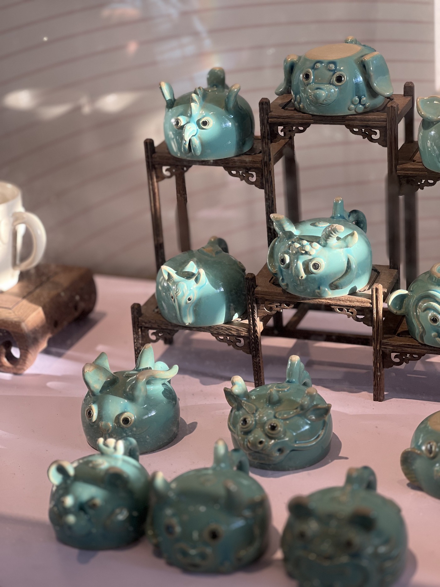 对手艺的坚守,体现在陈俊玮对釉色的钻研上,釉水上陶,呈现万千可能。他从中国古代传统名窑、釉色中找寻灵感,历经无数次的调试与烧制,调配出了豆青釉、孔雀蓝釉、绿白釉、天青釉、茶叶末釉、金星釉、钧瓷釉七种天然釉色,其所创品牌“七彩虹窑”由此得名。
