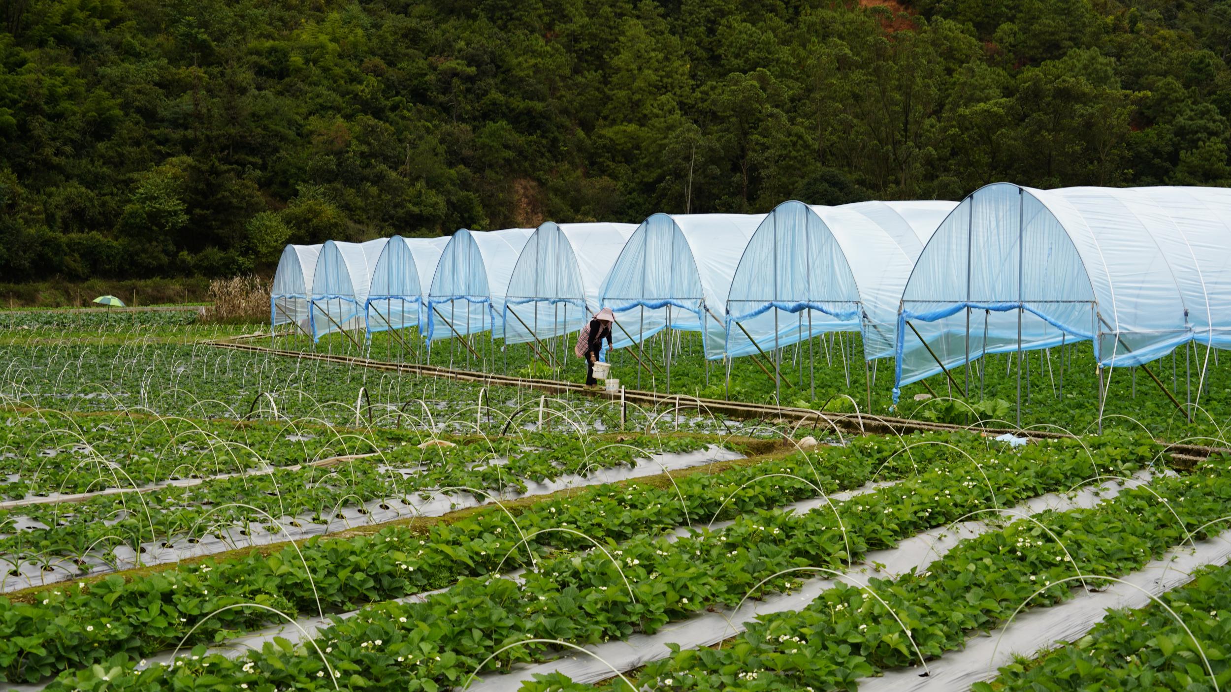 初冬时节,暖阳铺洒,玉溪市峨山彝族自治县小街街道舍郎社区的650多亩草莓迎来首波丰收。走进舍郎社区草莓种植基地,阳光照进一排排现代化大棚,叶绿果红,熠熠生辉,藤蔓间缀满了果实,馥郁的果香扑鼻而来,种植户普正忠穿梭在垄间采摘新鲜草莓。