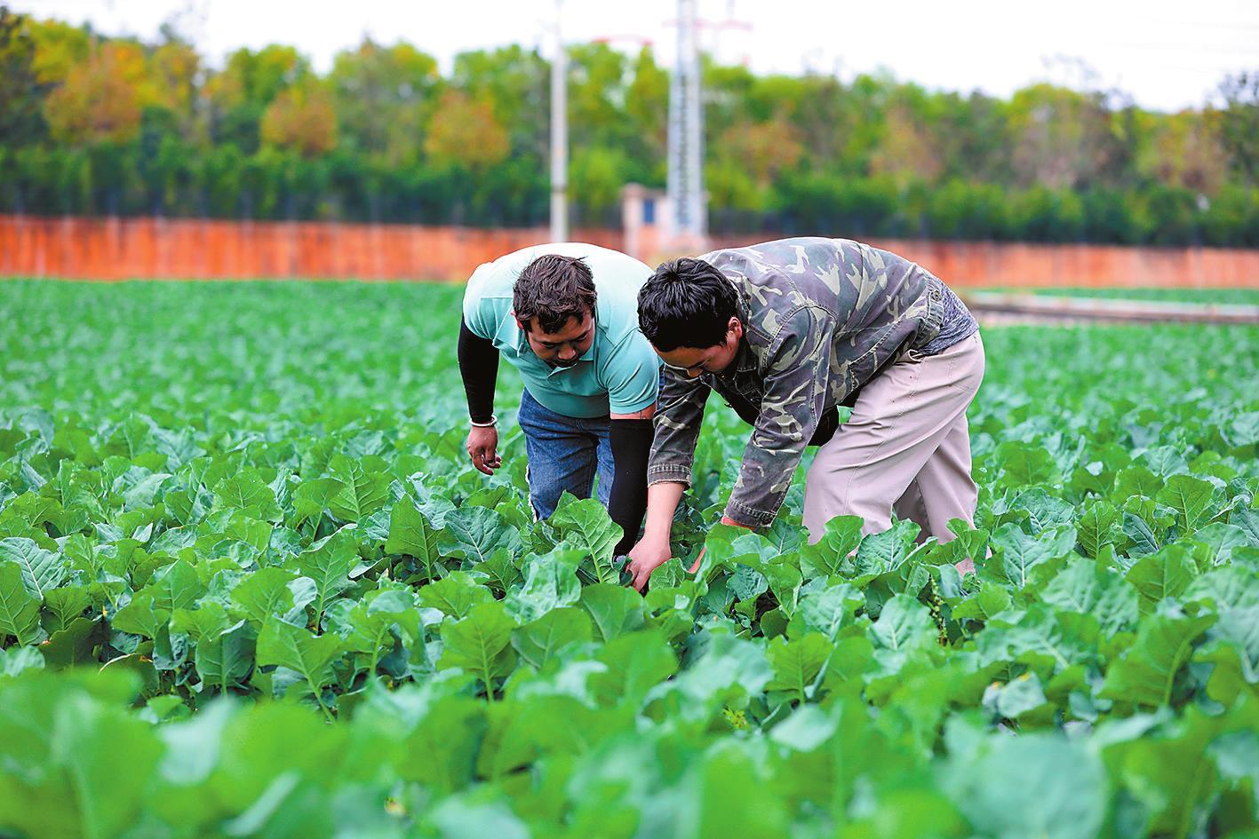 基地技术指导员查看西兰苔长势。