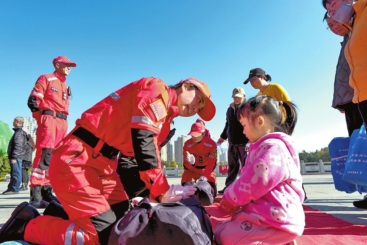 宣传展区内,市民及儿童创作的交通安全宣传主题作品吸引了不少人驻足观看,志愿者向过往市民发放宣传资料,进一步传递文明出行理念。应急救援队还现场演示了心肺复苏、海姆立克急救法,市民张女士跟着学习后说:“这些技能太实用了,关键时候能救命!”