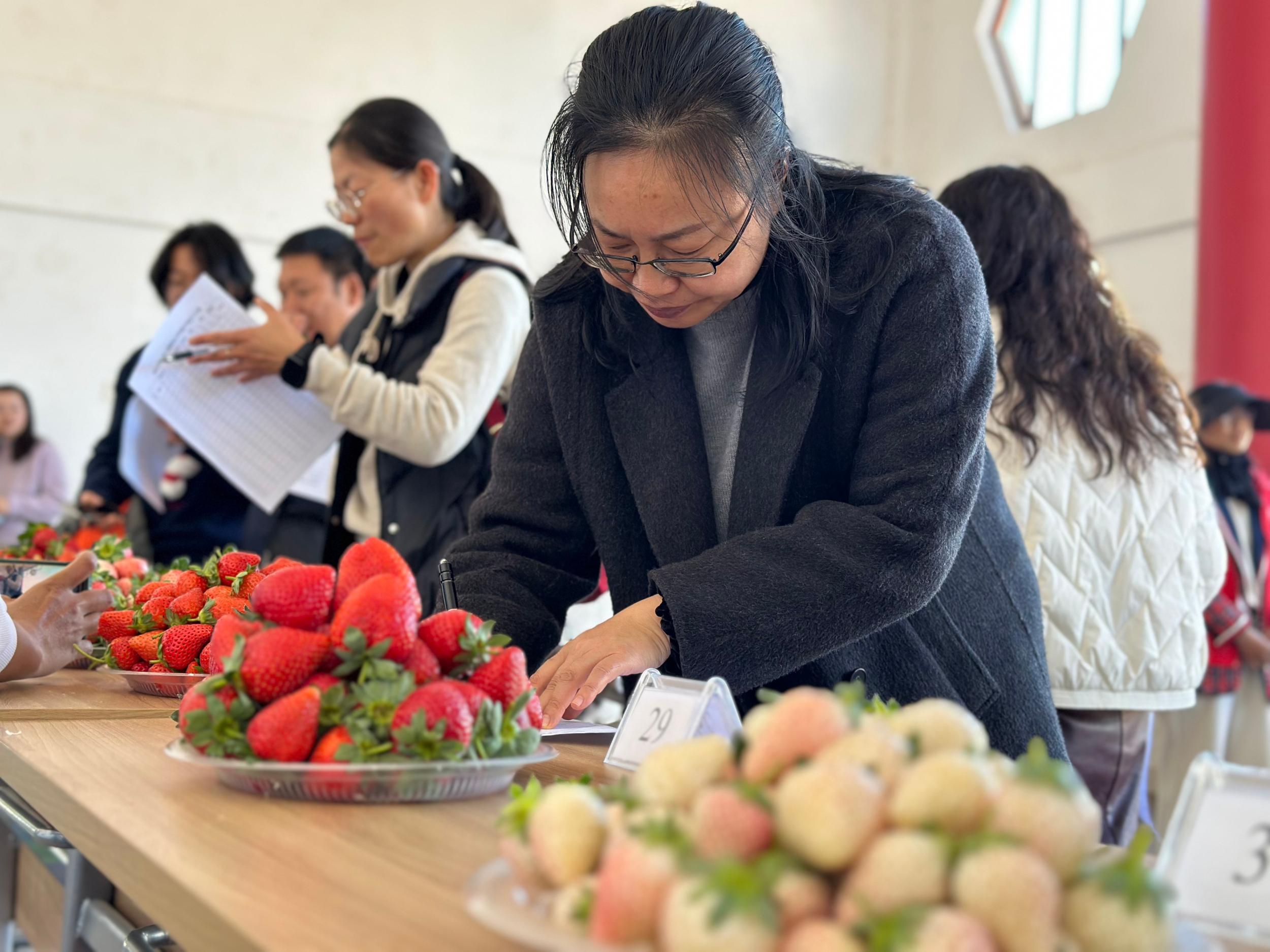 当天的精品草莓擂台赛现场格外热闹,40多个品种的草莓整齐排列,评委们通过看色泽、闻香气、尝口感逐项打分。当主持人宣布邱开凤的隋珠草莓、周建会的粉玉草莓荣获特等奖时,现场响起热烈掌声,两位种植户捧着奖牌,脸上洋溢着丰收的喜悦。来自全市各县区的农业技术人员、种植户代表围着获奖草莓仔细观察,不时交流种植心得,共谋发展路径。