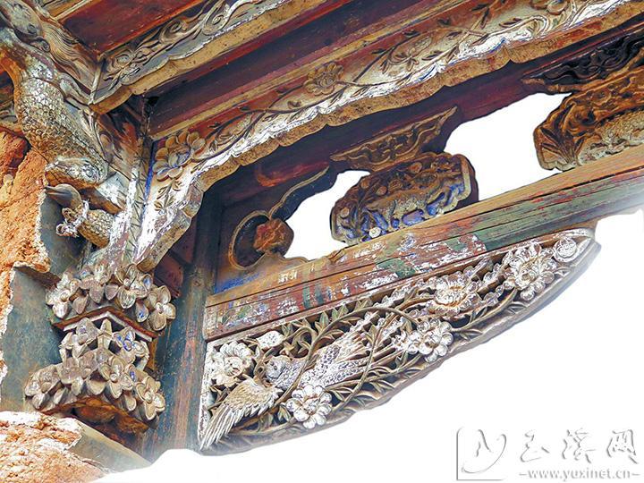 从建筑上看,它融合了汉彝精髓。歇山顶的山门檐角飞翘,彩绘木雕绚丽;院内是滇中典型的“一进四合院”“明三暗五”格局,正殿为双重檐悬山顶,木结构扎实。细看之下,檐枋彩绘是道教“暗八仙”纹样,而梁柱间的深浮雕木刻与石础上的浅浮雕石刻,既有汉文化中常见的缠枝牡丹、麒麟瑞兽、鹿鹤同春等,又透着彝族艺术的质朴与力度。这种交融,正是玉碗水自明代起便有汉族移民融入,文化互鉴的生动体现。