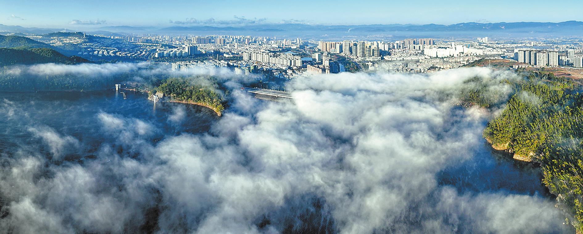 12月15日,冬日清晨,玉溪中心城区东风水库周边出现平流雾景观,云雾如轻纱般在城市楼宇与水库间翻涌,高楼在云海中若隐若现。而水库旁的山林间,朝阳穿透晨雾洒下金色光束,雾气与光影交织、城市与自然相融的画面,构成了一幅绝美的冬日晨景图。(记者 曾永洪 摄)