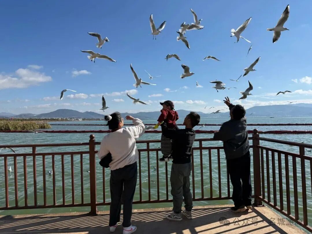 在这里,游客可选择乘坐各式观光车环湖漫游,或搭乘天鹅船泛舟湖上,从不同视角欣赏沿岸樱花盛放的浪漫景致与杞麓湖的潋滟波光。沙滩区域新增的公共健身设施,让游客在运动健身的同时,也能尽情拥抱湖光山色。造型别致的大提琴瞭望台更是成为标志性景观,登上瞭望台远眺,粉白相间的樱花林、澄澈如玉的湖面全景尽收眼底,随手就能拍出氛围感大片。眼下正值候鸟越冬的关键时期,每天清晨,成群结队的海鸥如约聚集在湖畔,游客可在指定区域与这些“小精灵”亲密互动,体验投喂海鸥的乐趣,感受人与自然和谐共生的诗意画面。