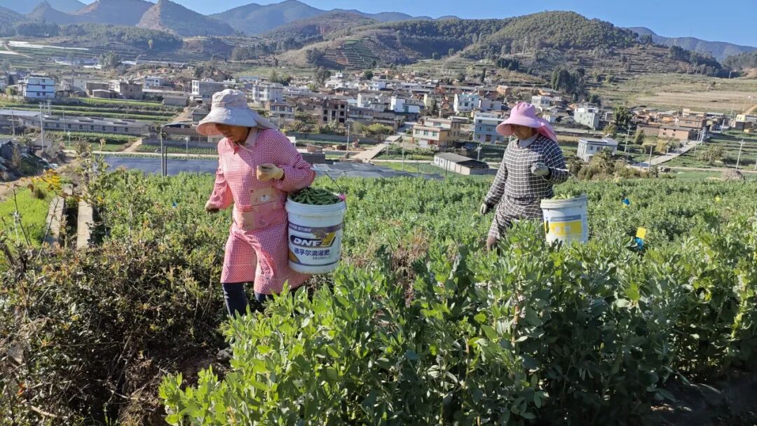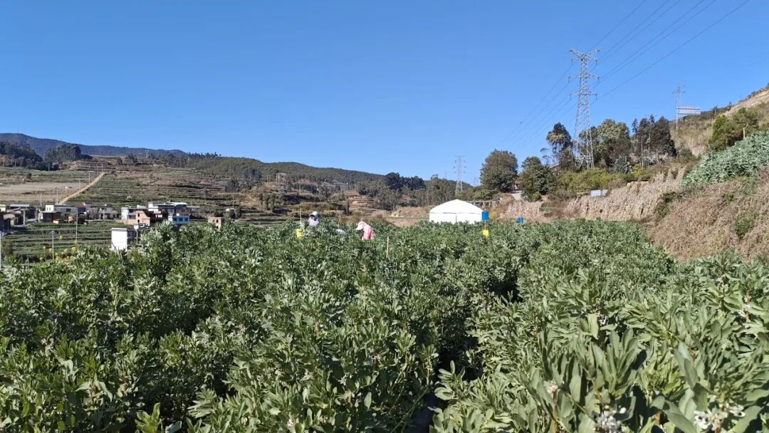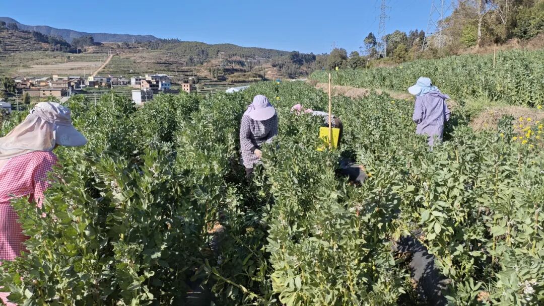 在蔡营社区李家营村,连片的蚕豆长势喜人,豆荚饱满,缀满枝头。农户们穿梭在田垄间,动作娴熟地采摘成熟的豆荚。这些新鲜蚕豆经过分拣后,将第一时间发往昆明市场。