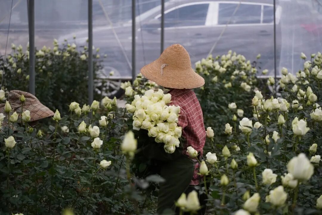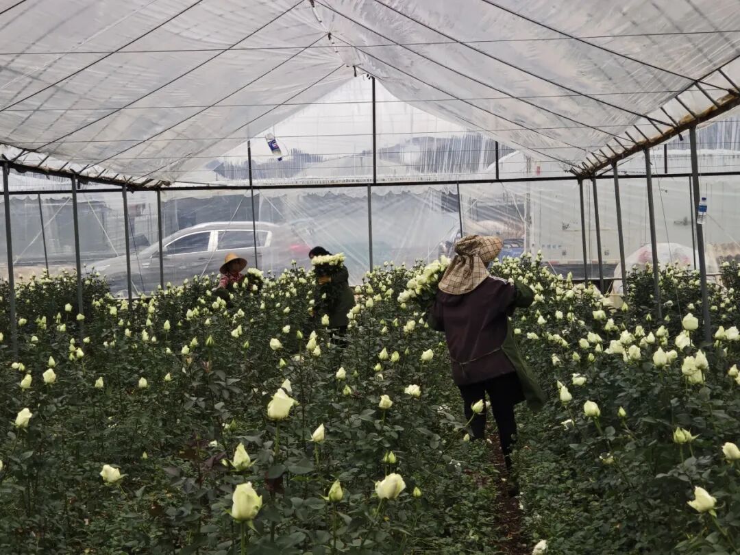 走进上村社区的鲜花种植基地,暖意融融。“骄傲”玫瑰雪白通透,开得灿烂,“高原红”和“洛神”玫瑰含苞待放。一个个花骨朵长满大棚,工人们穿梭在花丛间,采摘花朵。在基地的包装车间里,另一批工人也在忙碌地进行鲜花分拣和打包,一派繁忙的丰收景象。