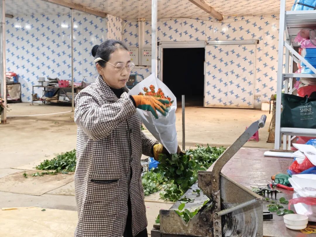 作为街道重点引进的企业,云南勋奇花卉有限责任公司依托当地自然条件、交通优势与政策支持,大力发展玫瑰鲜切花种植。目前,基地种植“苏菲宝贝”“橙色芭比”等多头玫瑰60余亩,年产鲜切花约500万枝。此外,通过“公司+基地+农户”的经营模式,公司不仅为村民提供了“家门口”的就业岗位,也带动了土地流转与集体增收。
