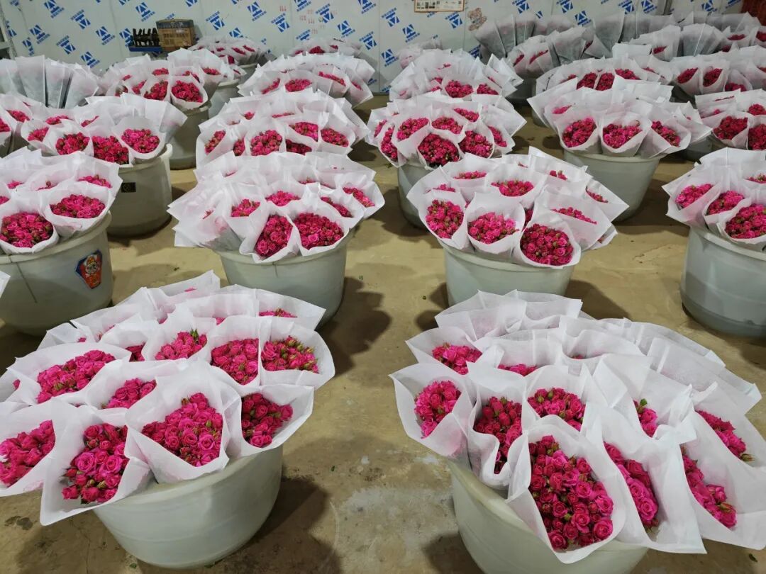 走进云南勋奇花卉有限责任公司的玫瑰种植大棚,暖意扑面而来。一排排玫瑰枝繁叶茂,饱满的花苞点缀其间。技术管理人员正仔细查看玫瑰长势,工人们则有条不紊地进行采摘、分拣、修剪等作业,包装好的玫瑰花当天便直接运往斗南花卉市场。