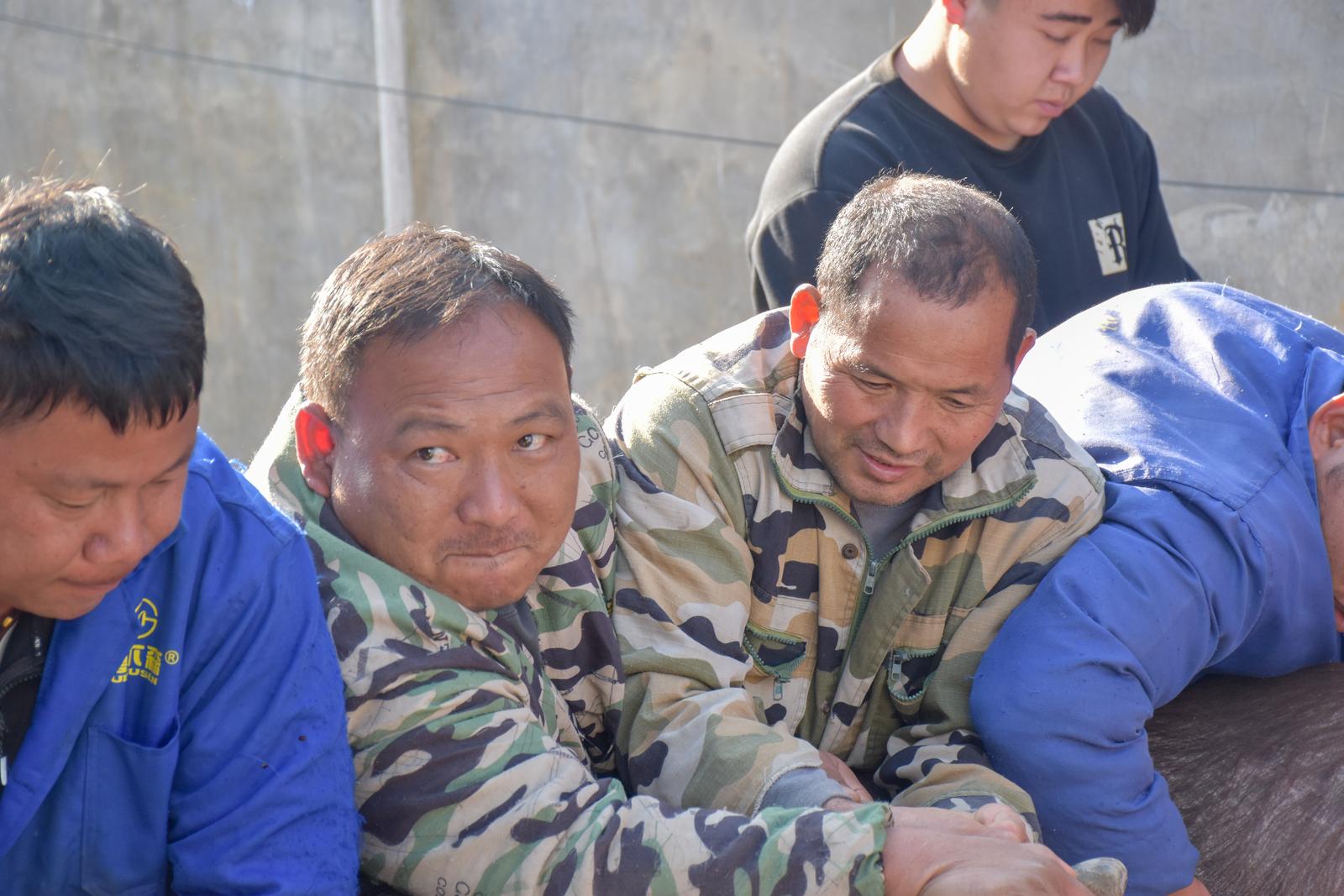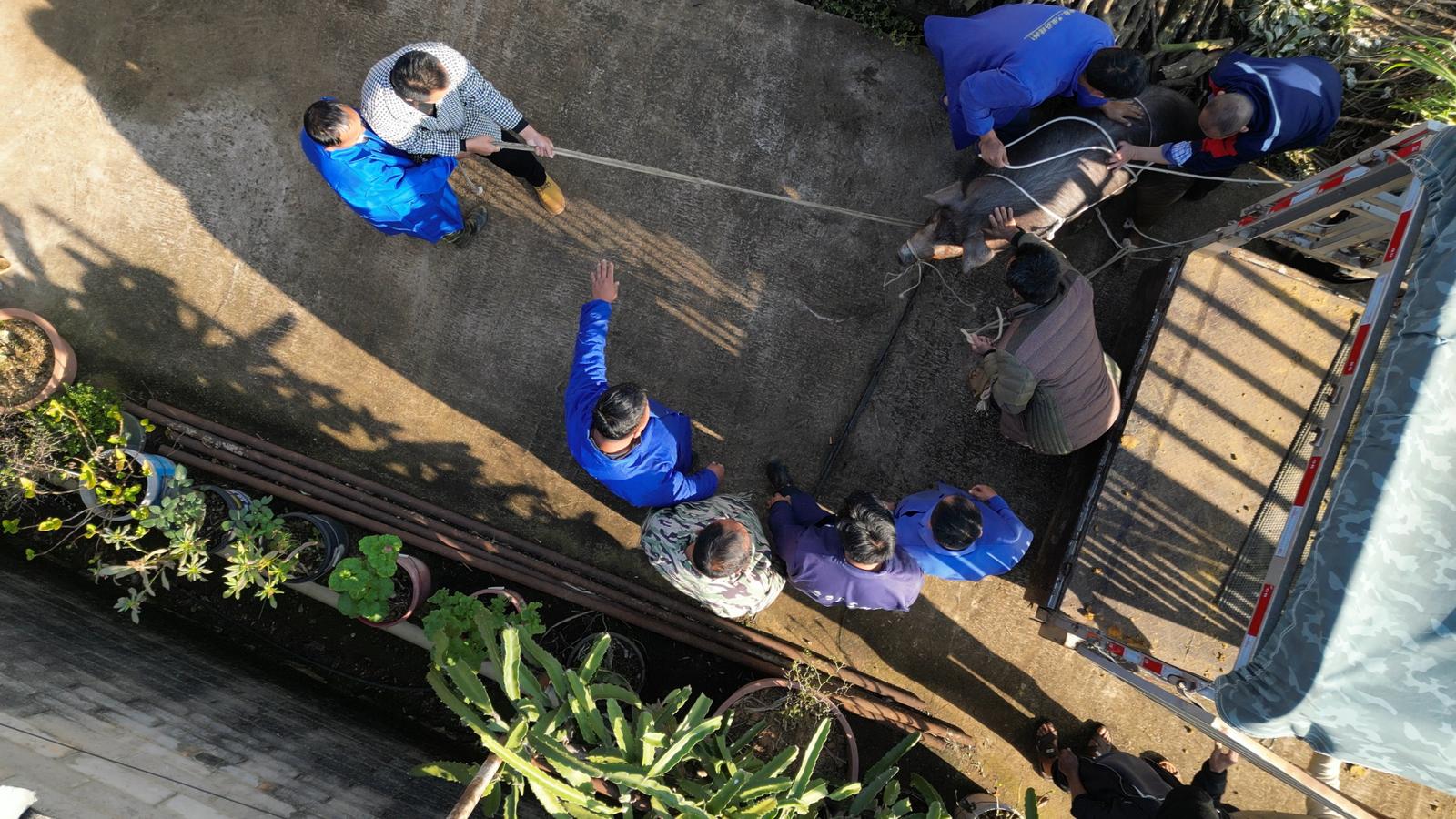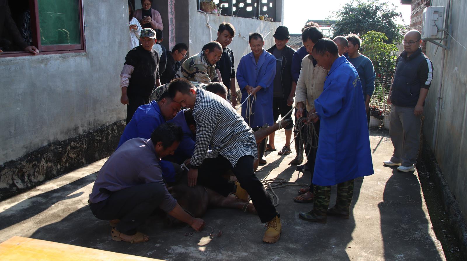 进门时,灶台上宰年猪所需的开水已烧得滚烫,母子几人正忙着收拾庭院,等候亲友到来。不久,载着四百多斤年猪的小货车抵达,七八个亲戚朋友合力将年猪赶下车、按翻绑好,抬上案板……