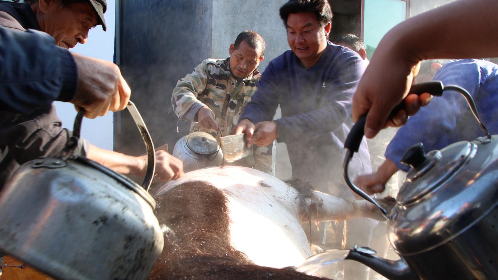 “早上五点就要起来烧水,开水要慢慢地倒,才烫得好、刮得白,肉吃起来才香”杀猪匠李光云一边趁着热气麻利地处理年猪,一边说道。