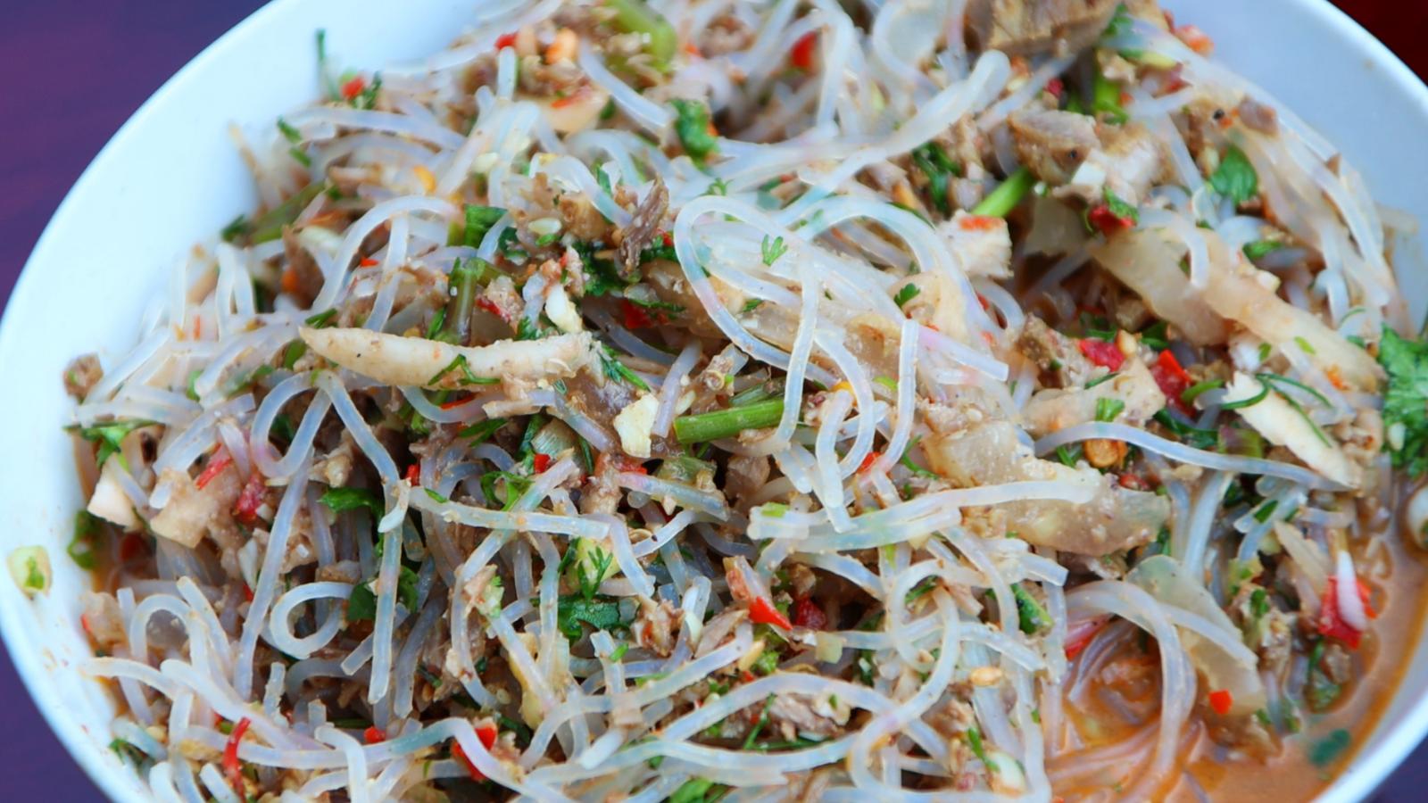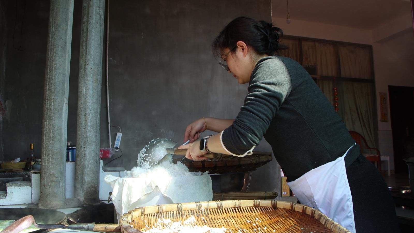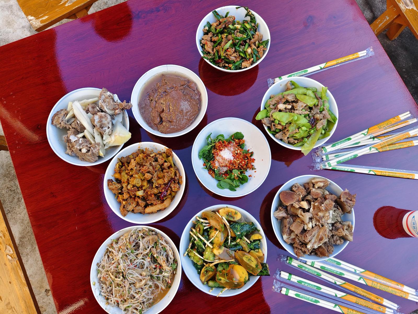 “肝生”的做法颇为复杂,需将新鲜猪肝、瘦肉油炸炒香切碎,猪皮煮好切条,倒入农家腌制的地道酸汤,加入焯水的粉丝,再撒上葱姜蒜末、糟辣子等佐料,吃起来鲜、香、酸、辣,味道十足。同时,下厨的每个人都各自发挥所长参与到美味制作中。棕头煮排骨地道鲜香、猪血蒸蛋嫩滑爽口、腌菜炒肉咸香下饭……一道道家常菜虽无复杂技法,却满是乡土风味。