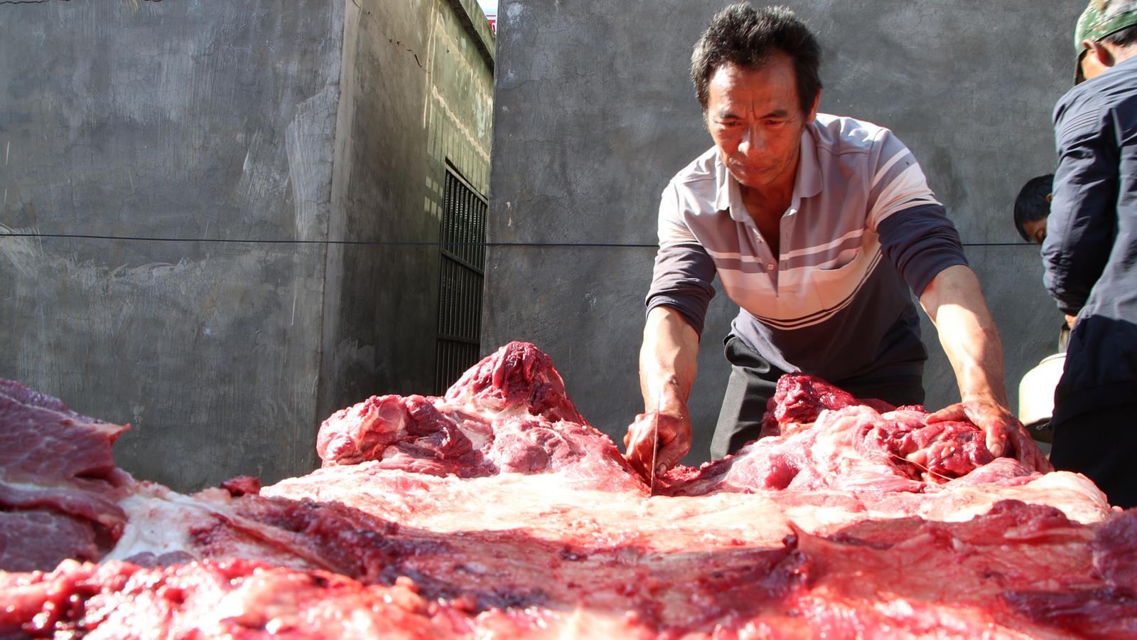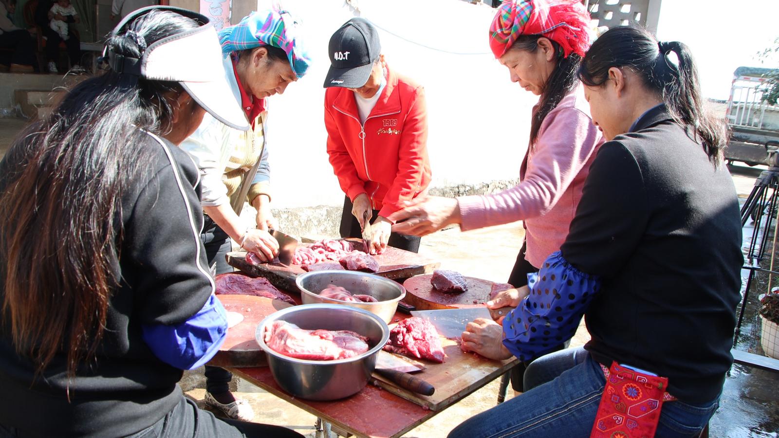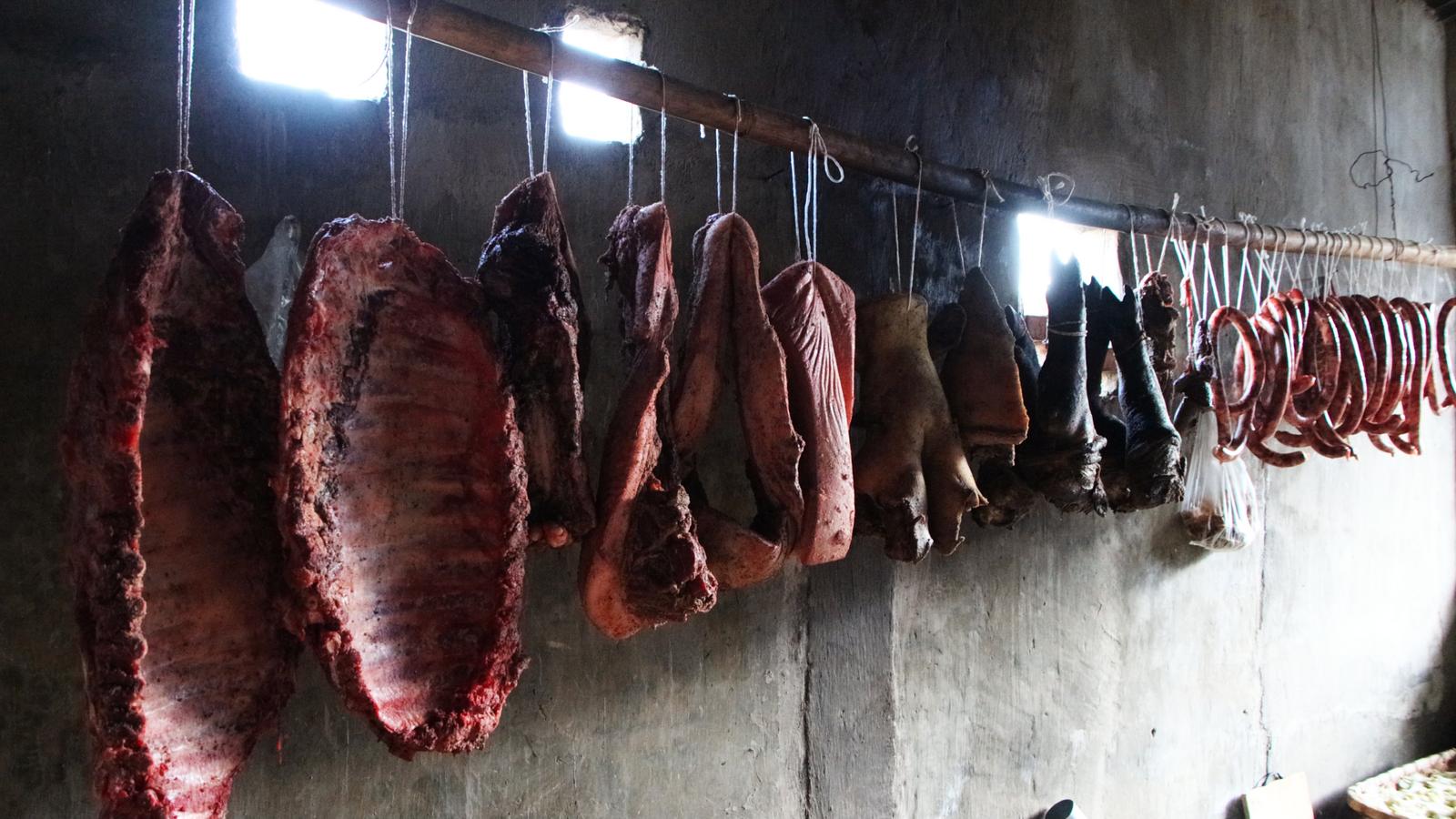 “来帮忙的亲戚包括叔叔、姑爹、表叔,远近的邻里亲戚都来帮忙参与,每年这个季节都相当热闹。”李云海介绍,新平哀牢山下前年一个月就开始宰年猪,一部分猪肉撒上粗盐腌制挂起,风干成腊肉香肠,为春节做准备,另一部分则新鲜下锅,做成当晚的盛宴。