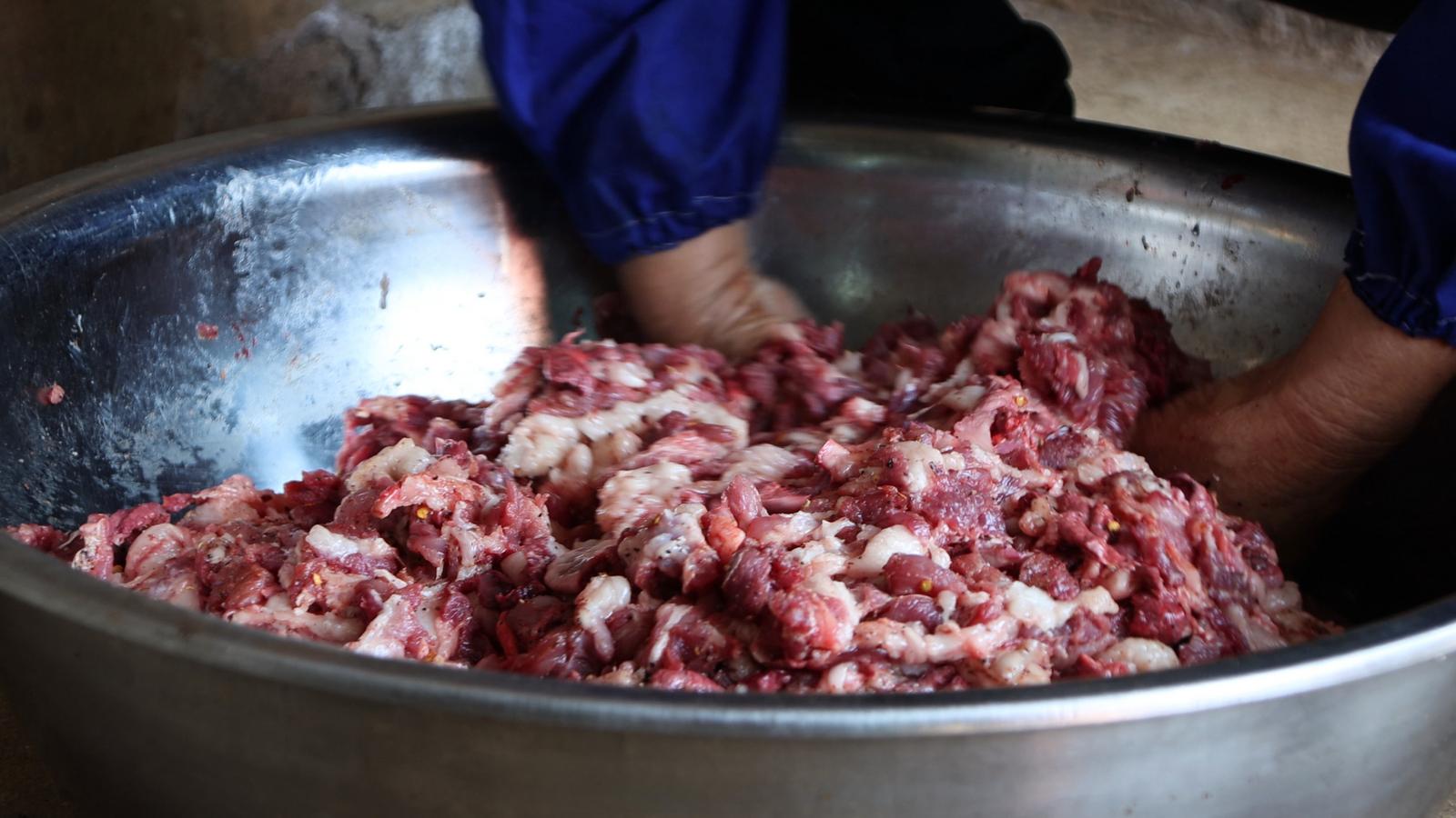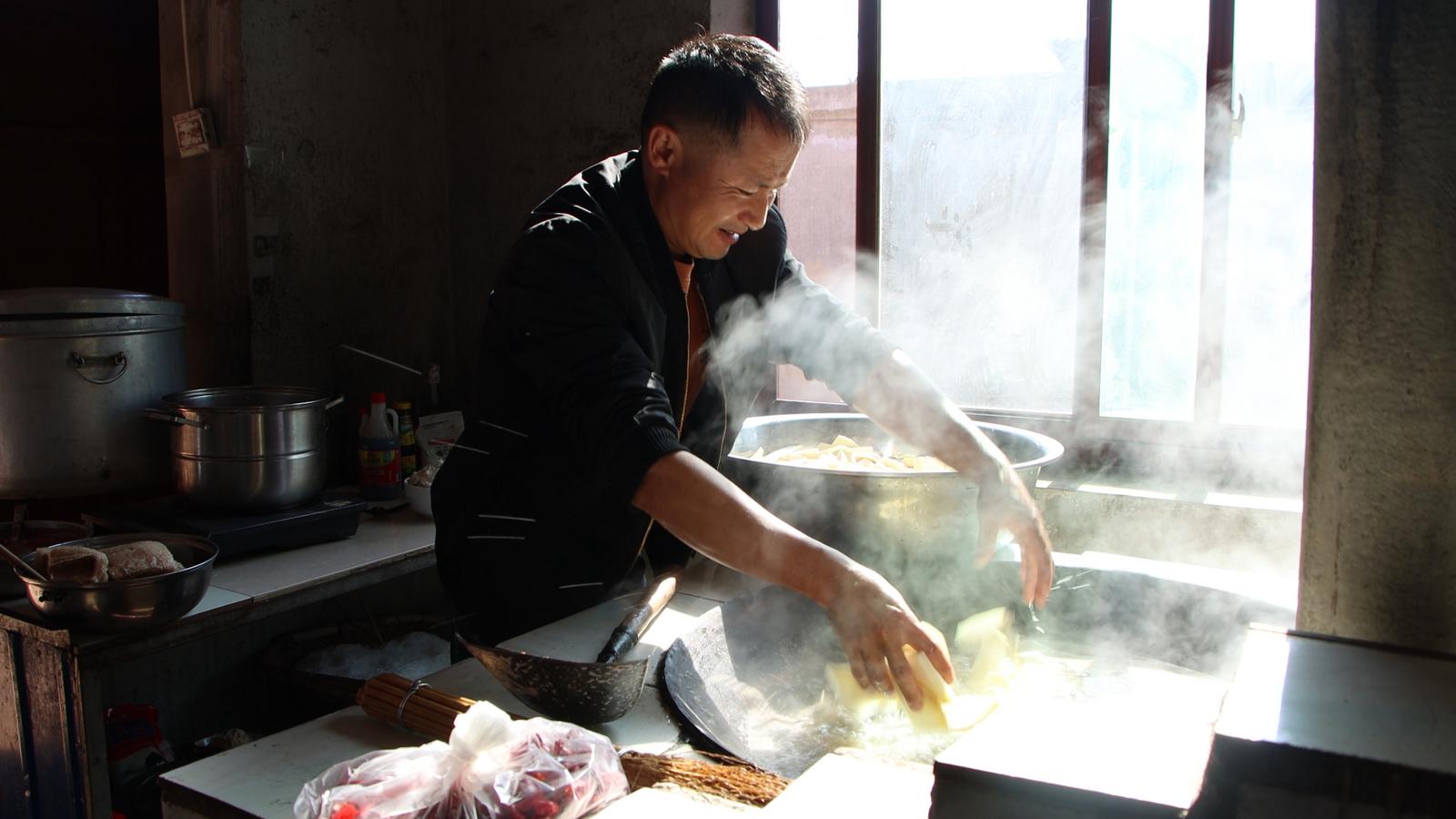 在此起彼伏的切菜声中,厨师李文兴正专注制作特色菜肴——肝生,这是当地家家户户杀猪饭必吃的美食。“这是老祖宗传下来的菜,到现在都没改变,是年猪饭的第一碗菜,不吃这道菜就像没吃杀猪饭一样。”李文兴说。