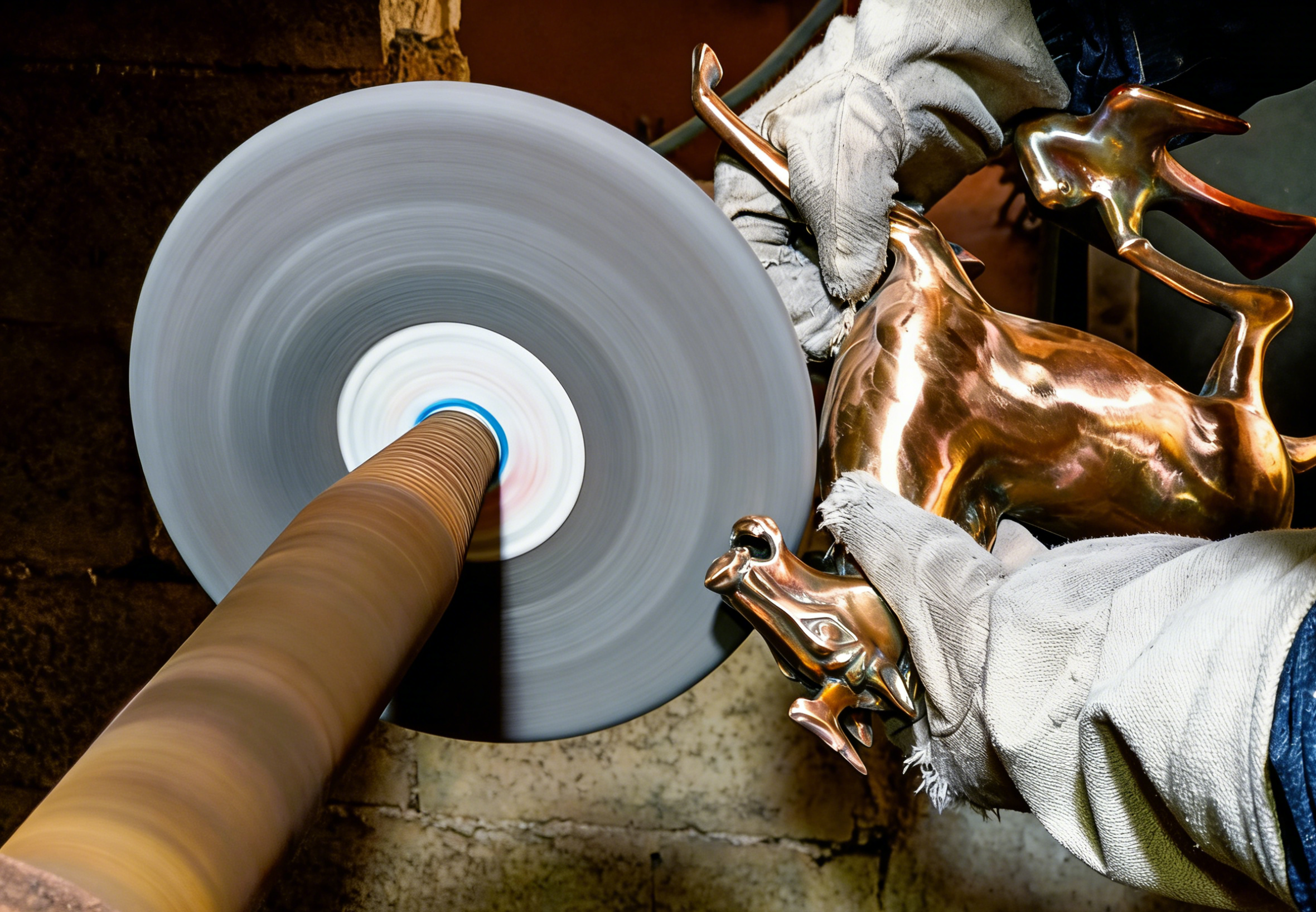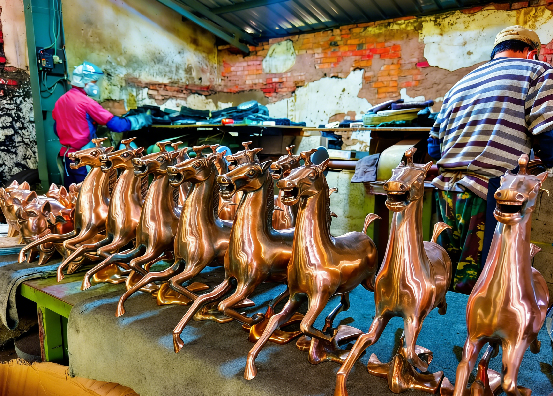 在江川区三有铜器工艺品厂,打磨机声不绝于耳,工人们正对马形铜产品进行精细抛光,每一处细节都彰显着匠心。