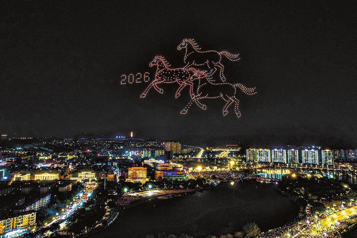 大年初三和初四,玉溪聂耳广场上演无人机秀。无人机编队以“玉见米线 福满红塔”“幸福红塔 新春启航”为主题,将本土文化、地标元素与新春祝福融入光影,让科技与年味交融。活动吸引数万名市民与游客驻足观赏,大家用镜头定格美好瞬间,现场气氛喜庆热烈。(李冉)