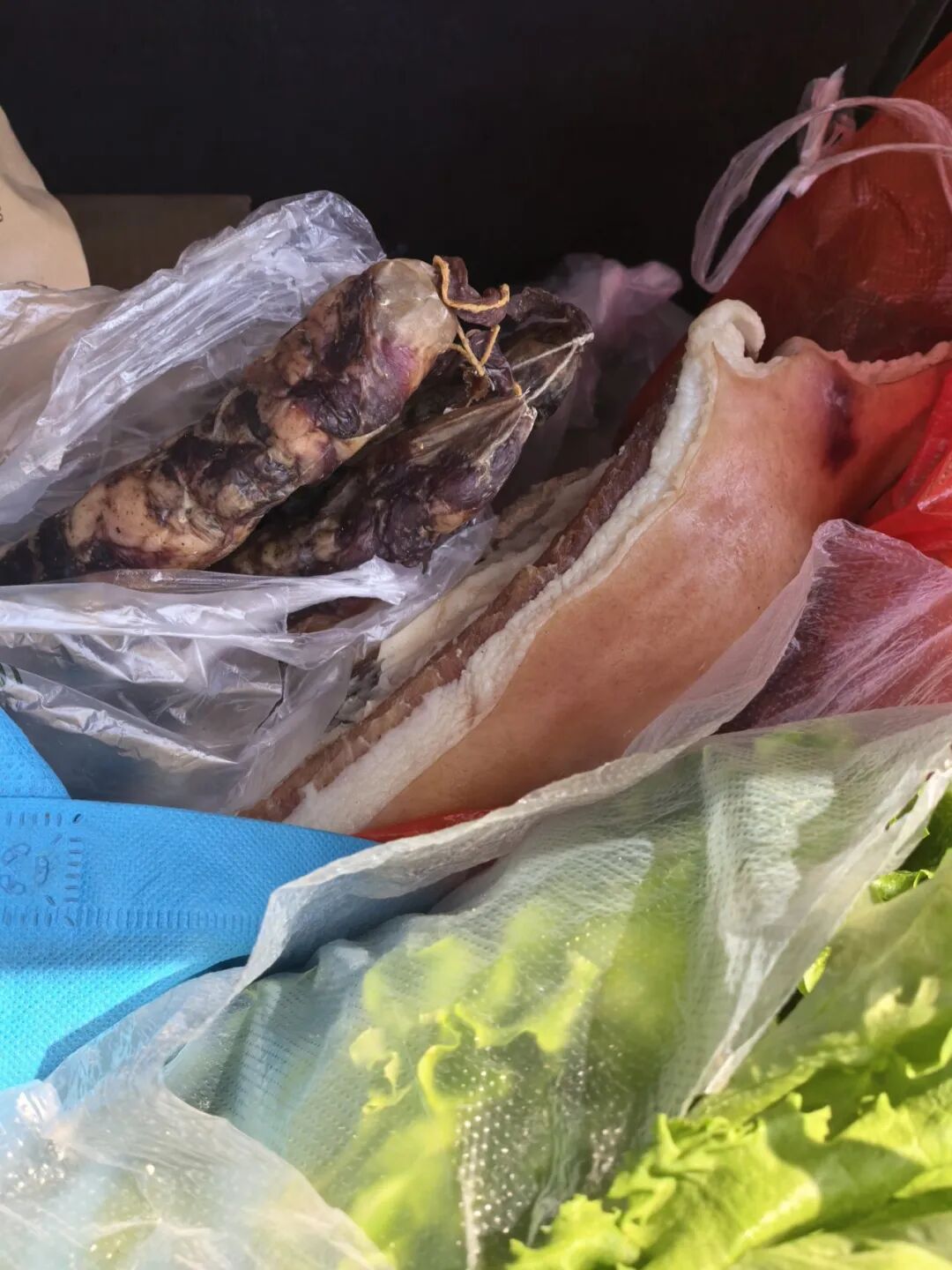 新鲜蔬菜、腊肉、香肠、土产干货……