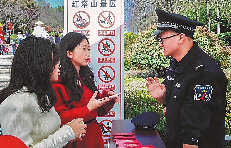 第三站:红塔山。红塔山作为城市地标,是广大游客登高赏花、游玩观光的必到打卡地。春节期间,红塔山脚下的“春风警务站”为广大游客和市民提供问询指引、失物招领、紧急救助等服务,让游客感受到随时随地的守护。