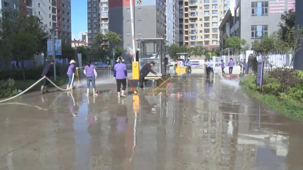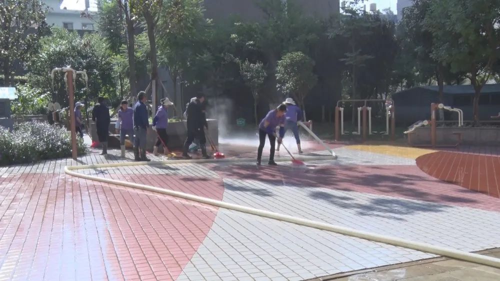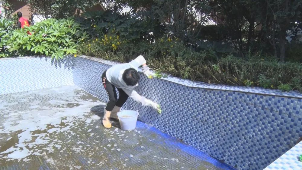 在小西城小区,物业公司的保洁员及社区增派的工作人员共同对小区内的停车场、路面进行冲洗、清扫,集中清除绿化带垃圾和卫生死角,对公共设施进行了全面消毒。隔壁的龙景苑小区,保洁员也正在对小区内的水池进行全面清洗,经过保洁员几个小时的劳作,水池焕然一新。