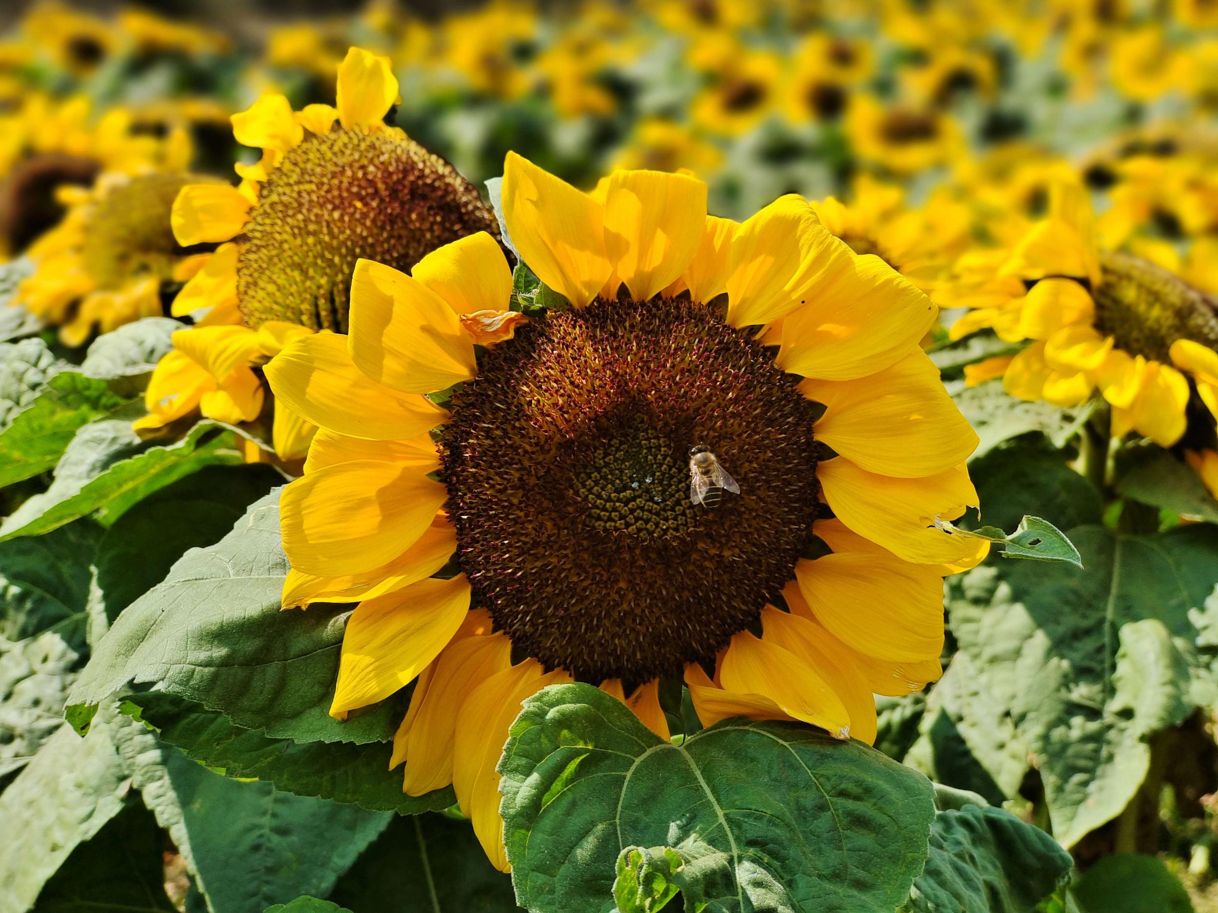 市民、游客穿梭于油画般的花海中,一垄垄金灿灿的向日葵,昂着头挺着胸站立在田间,三两只小蜜蜂不停地嗡嗡飞舞于花间。有的市民成群结队赏花,有的市民带着孩子悠闲自在地走走停停,花田间传来了阵阵欢声笑语。