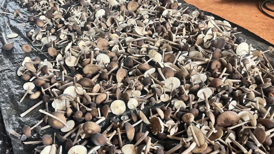 处理区内,村民们围坐在一起,对新采摘的鸡枞菌挑拣分类,再用小刀轻轻削去菌柄附着的少量泥土。处理干净的鲜菌一部分直接装筐,当日采摘、当日上市;另一部分经过自然晾晒制成干货延长保质期,拓宽销售渠道。